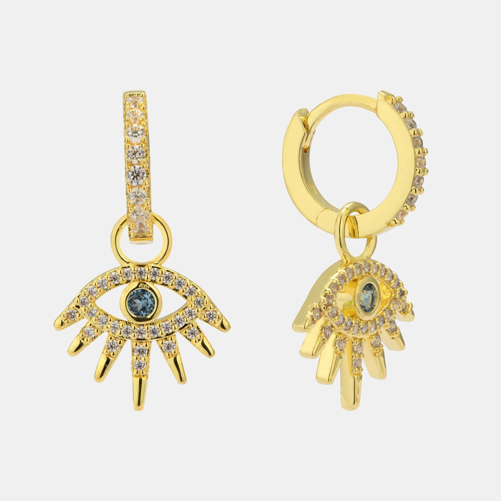 Add a touch of charm and protection to your look with our Malocchio Earrings (Malocchio is Italian for 'evil eye'). Featuring a delicate hoop with a suspended evil eye charm, these earrings are set with shimmering white and blue gemstones adding a stylish and symbolic touch to any outfit.